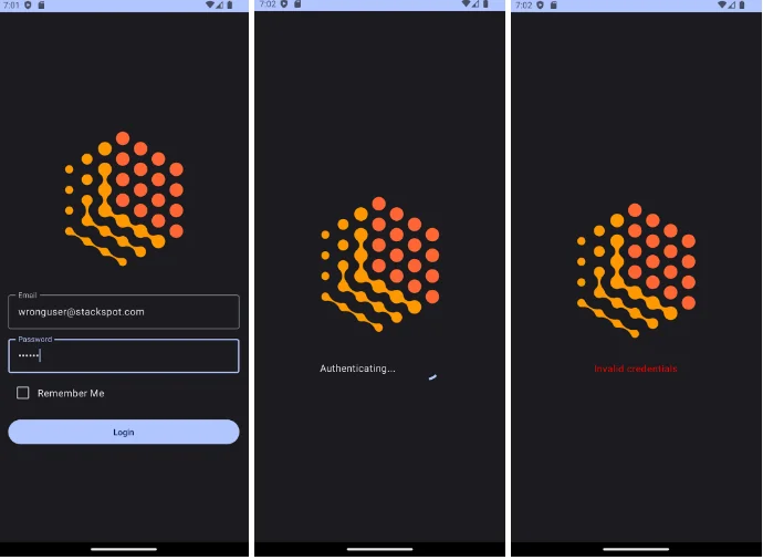 Click the button that runs the application. If you don’t have any physical device available, use the emulator. The images below show the app in the scenarios of valid credentials and invalid credentials.