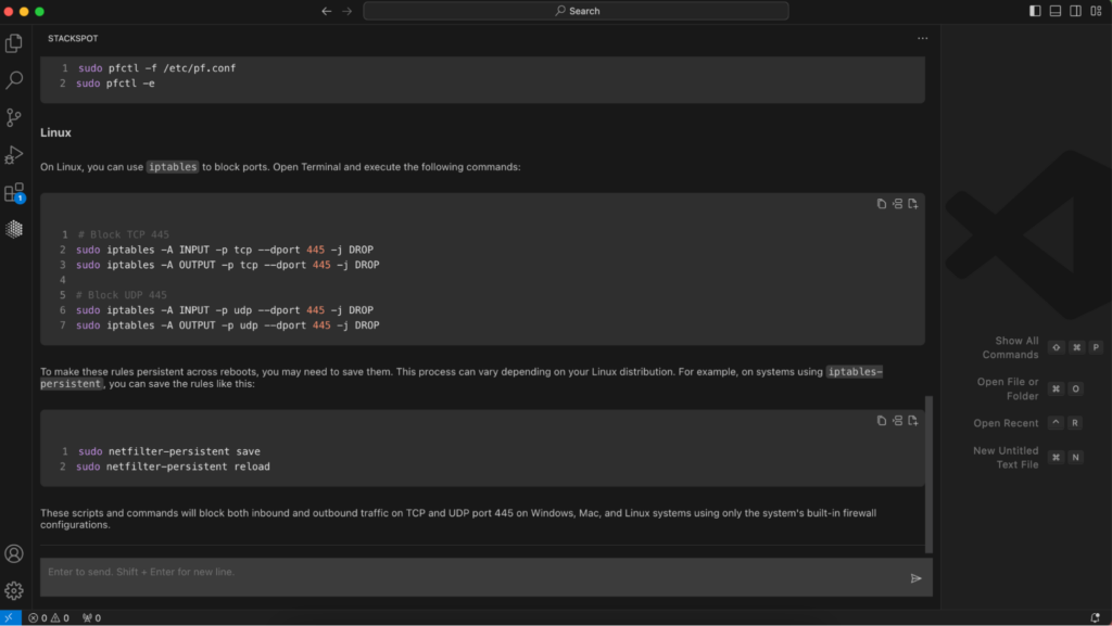 For instance, the figure below illustrates some of the scripting suggestions provided by StackSpot AI to block UDP/TPC ports.